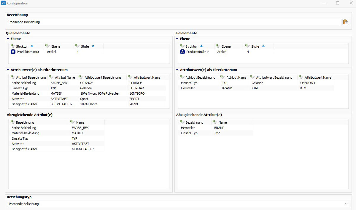 Beispiel 2 „passende Bekleidung“: Die Auswahl der passenden Bekleidung für ein Motorrad hängt von verschiedenen Kriterien ab. Dazu zählen Eigenschaften wie Farbe, Material oder Einsatztyp der Bekleidung. Diese werden am Quellelement (Bekleidung) festgelegt. Eine automatische Referenzierung erfolgt nur, wenn am Zielelement (Motorrad) die entsprechenden Merkmale wie Hersteller und Einsatztyp des Motorrads gepflegt sind. Durch diese Bedingung werden alle orangefarbenen Jacken, die aus Materialien für den Geländeeinsatz bestehen, automatisch an alle Motorräder referenziert, die vom Hersteller X sind und für den Geländeeinsatz ausgelegt sind.